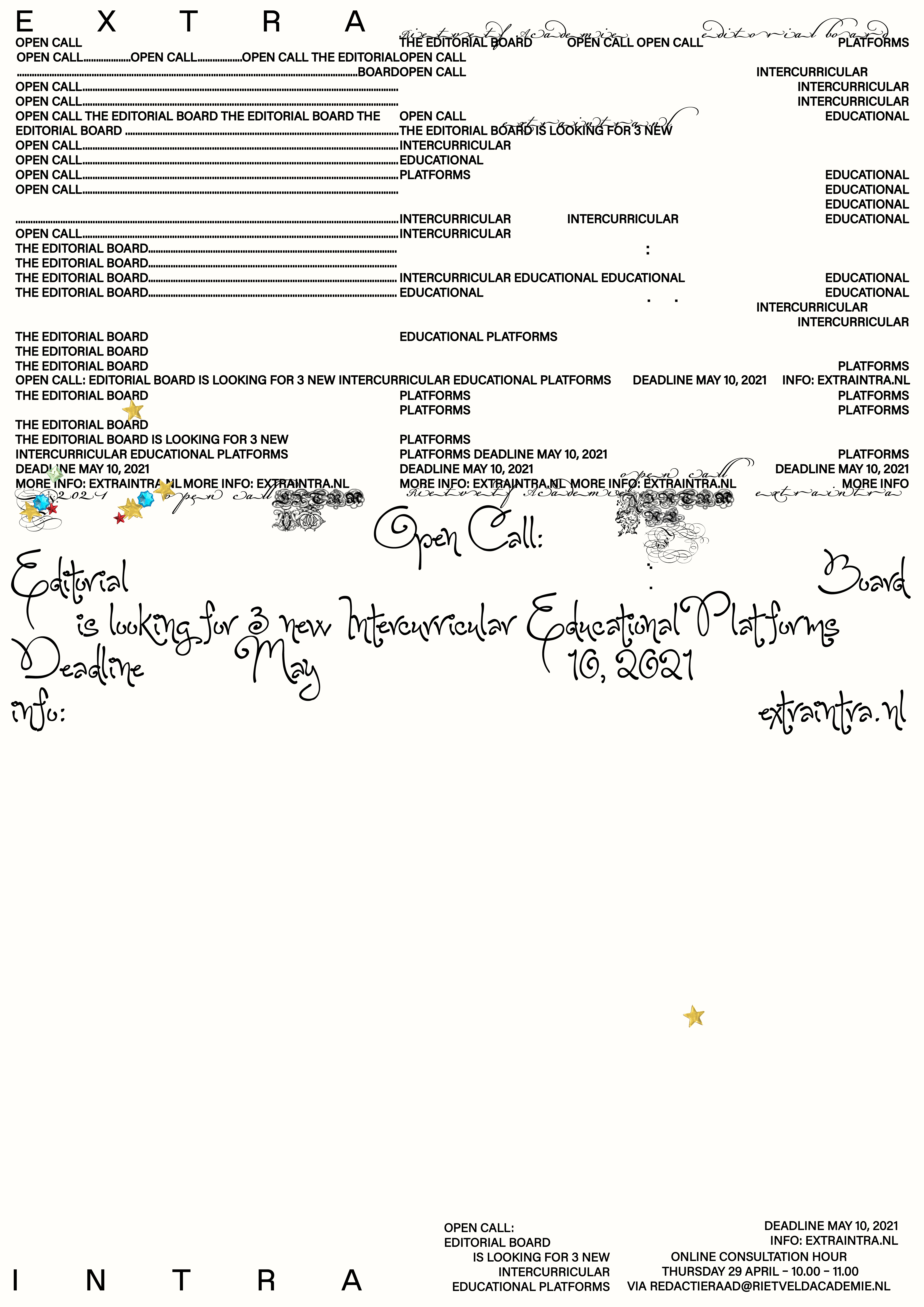 Send your project plan and budget to redactieraad@rietveldacademie.nl before May 10, 2021. The editorial board will select the 3 proposals in May and June 2021, and will take into account (amongst others): Urgency of proposal, feasibility, originality in either (new) educational model or approach, or topic.