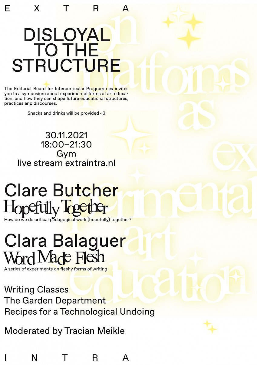 Moderated by Tracian Meikle, the three student-led, self-organised research platforms initiated in January 2021 shared their creative output. Writing Classes demonstrated a practice of collective automatic writing, through both text and spoken word. Recipes for a Technological Undoing shared the year-long programme they compiled to combat techno-determinism. The Garden Department showed how a small plot of land around a burnt tree can become an outdoor classroom, allowing the borders of the academy to become permeable to worms, plants, birds, passers by and other living things.