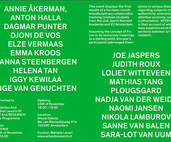 come and visit APOPHENIA, the final exhibition and launch of the publication of the 2015-2016 Honours Programme ART and RESEARCH of de Rietveld and UvA. Opening on 24 November from 16:00 at Nieuw Dakota, Amsterdam North. Also be welcome to visit the discussion on confrontational spaces on Sunday 27 November at 15:00