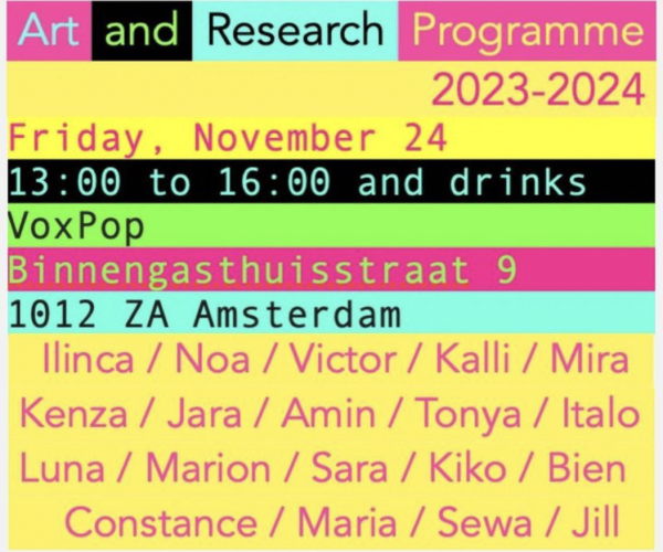 Hey! Just a quick reminder that tomorrow (24/11) there will be an open midterm presentation of the Art and Research program 2023-2024. It starts at 13:00 at VoxPop (Binnengasthuisstraat 9). Hope to see you there..!