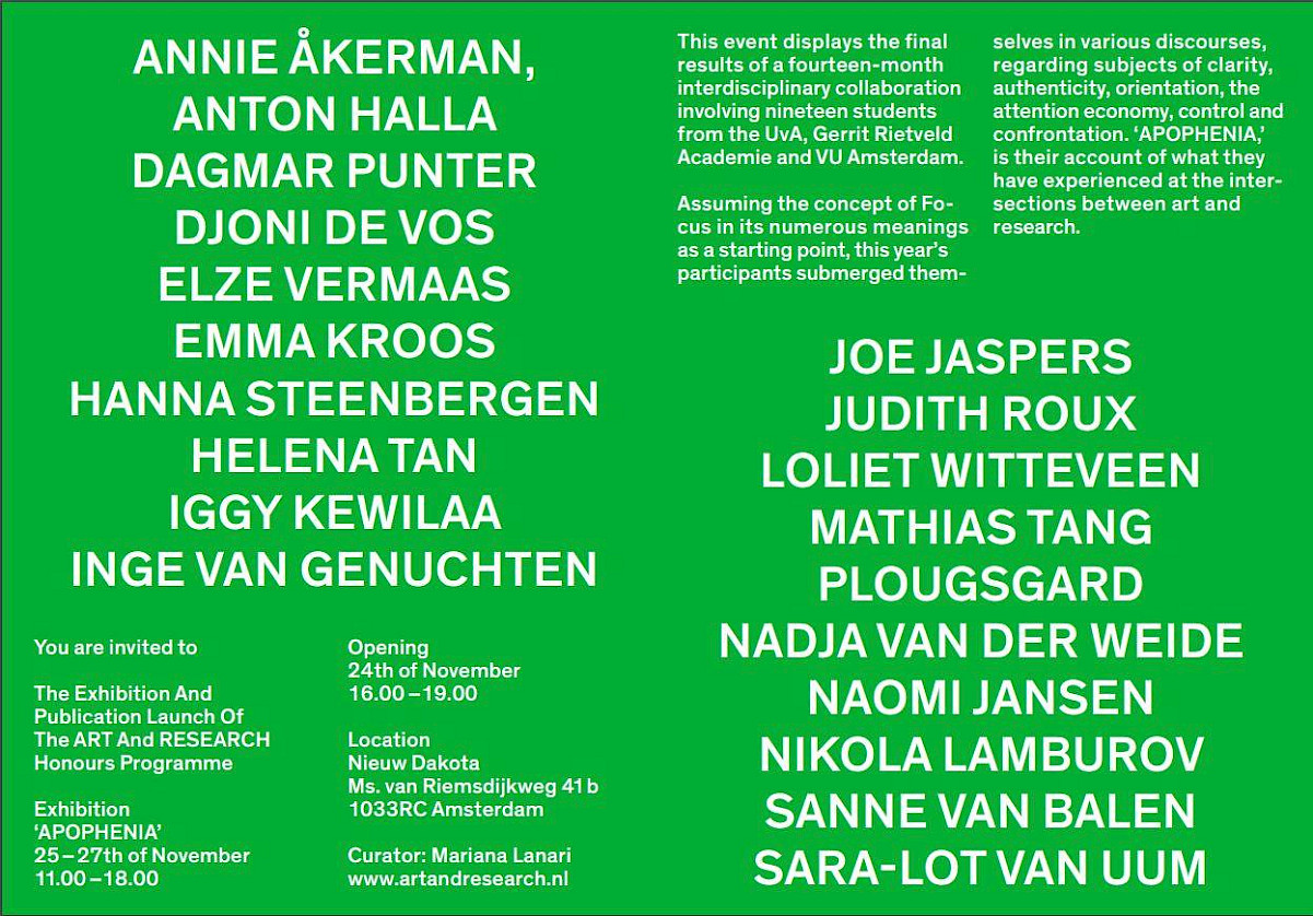 come and visit APOPHENIA, the final exhibition and launch of the publication of the 2015-2016 Honours Programme ART and RESEARCH of de Rietveld and UvA. Opening on 24 November from 16:00 at Nieuw Dakota, Amsterdam North. Also be welcome to visit the discussion on confrontational spaces on Sunday 27 November at 15:00