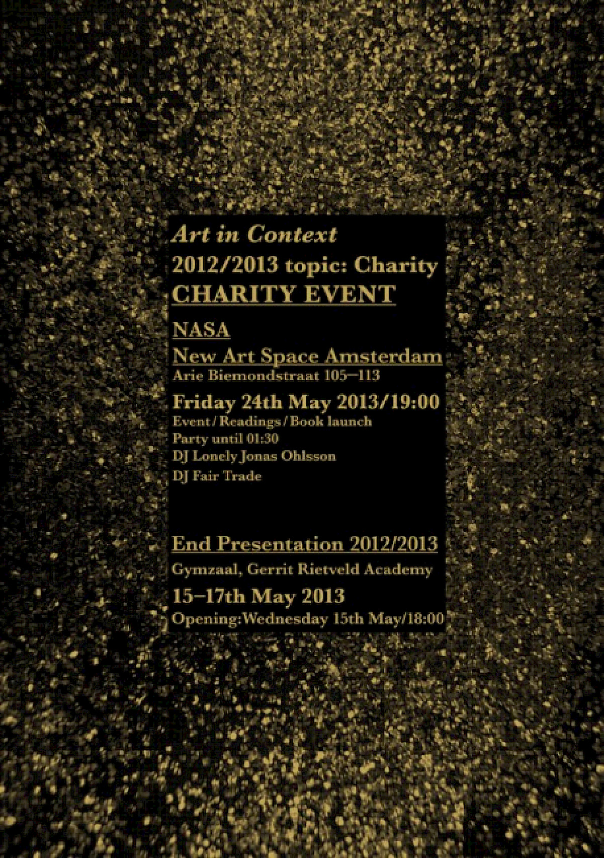 12 students from the Art in Context* program will show results of a year-long work with the subject of 'Charity'. The opening is on Wednesday the 15th of May at 18.00, the exhibition runs until Friday the 17th of May.