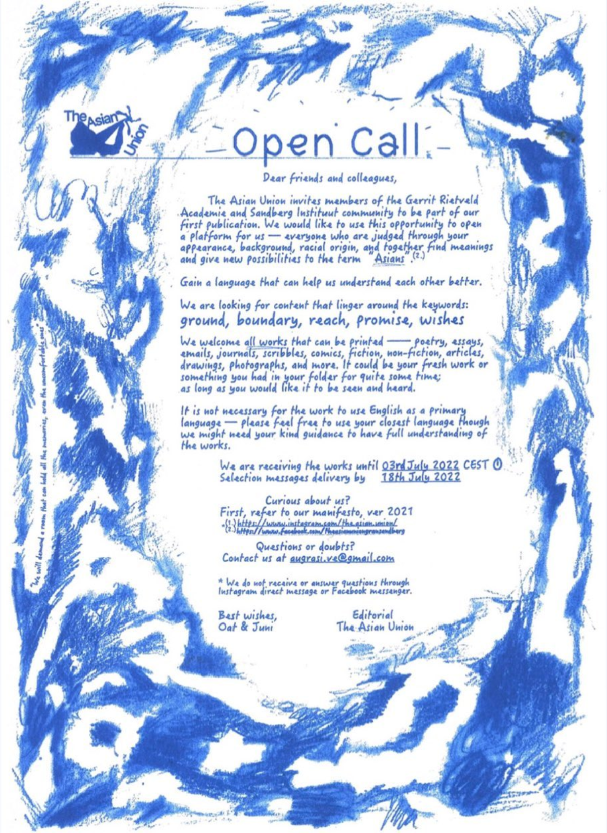 The Asian Union invites members of the Gerrit Rietveld Academie and Sandberg Instituut community to be part of our first publication.