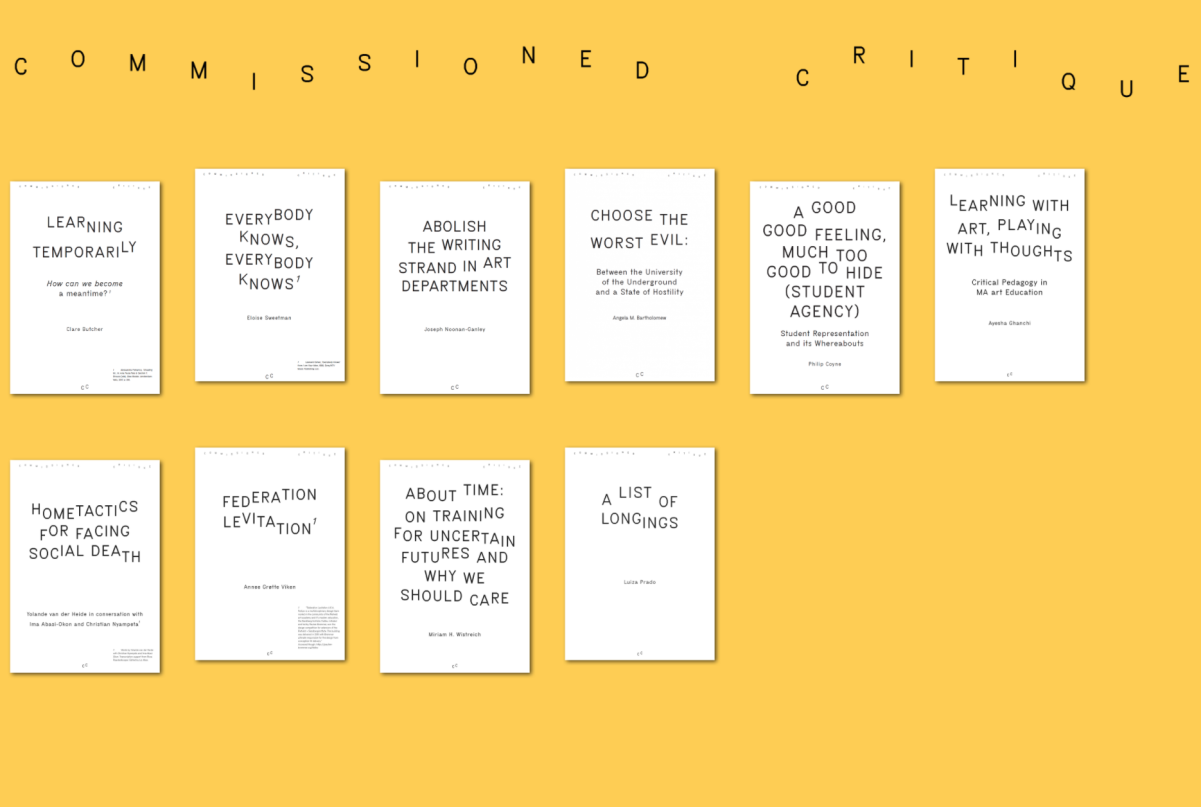 Commissioned Critique is an ongoing series of essays commissioned by the Sandberg Instituut and semi-independently edited by Rosa te Velde and Huib Haye van der Werf. Commissioned authors include: Clare Butcher, Eloise Sweetman, Joseph Noonan-Ganley, Angela M. Bartholomew, Philip Coyne, Ayesha Ghanchi, Yolande van der Heide, Annee Grøtte Viken, Miriam Wistreich, Luiza Prado.