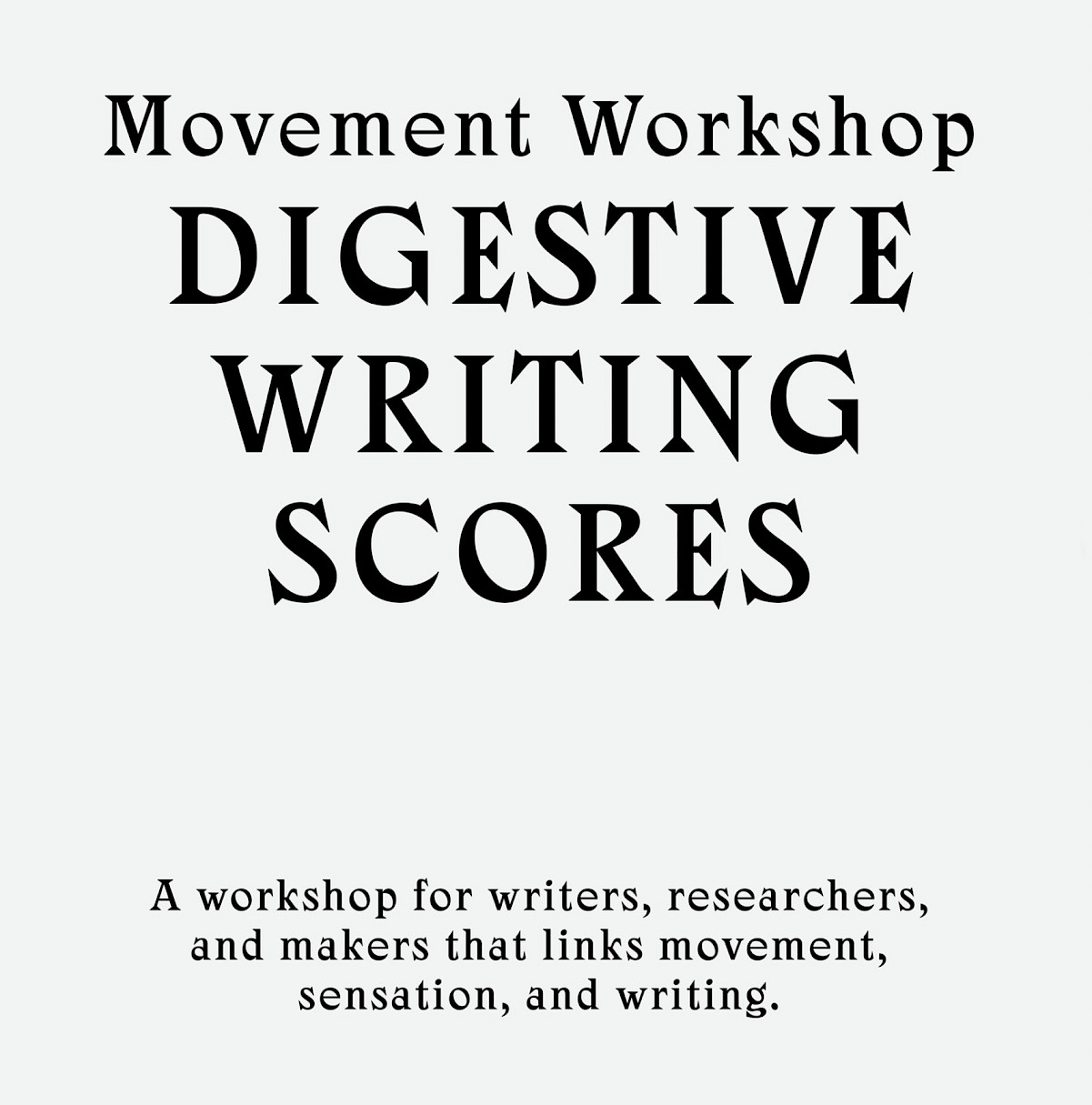 Digestibe Writing Scores is an open movement workshop for writers, researchers, and makers who wish to nurture links between sensation, movement, and writing practice. Each session will revolve around three scores that integrate body scans, gentle movement improvisation, and somatic reflective journaling. This workshop emerged from a personal need and has evolved into a collective practice. Writing is related to as something that moves through the body. Exercises are adjustable to accommodate any range of movement, and do not require any prior movement experience.