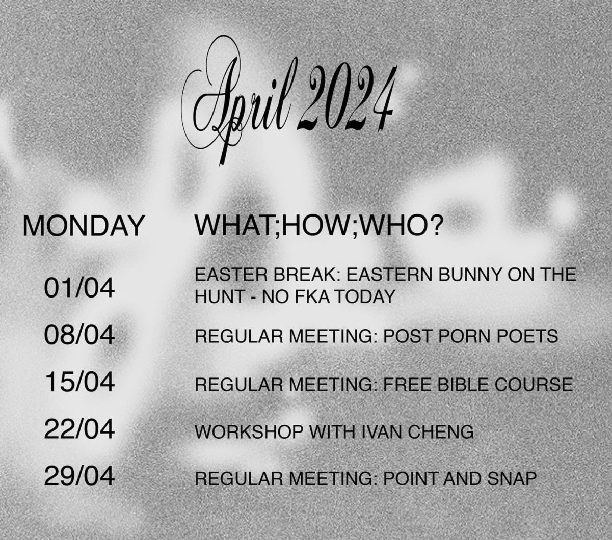 Next meeting Monday April 15 see you at 16:30 living room, same as always, everything and everyone welcome, writing try outs, xperiments let’s goooo