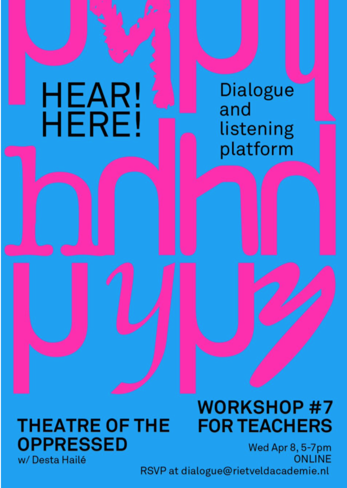 Hear! Here! is an experimental listening and dialogue platform that works to encourage a culture of dialogue for students and staff of Rietveld and Sandberg. How can we learn to talk across difference? In 2019/2020, the project was two-fold. Together with our editorial team, we organised monthly dialogue workshops open to all Rietveld and Sandberg teachers and monthly dialogue event for students, teachers and staff. Due to COVID-19 we transitioned to online workshops.