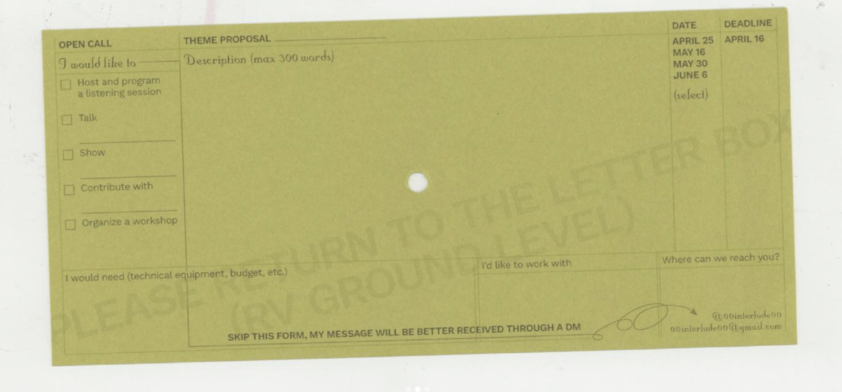 interlude organizes listening sessions from March 2023 at the Rietveld Academie and its surroundings. This year, we are launching an open call to invite you to contribute with an idea for a session.