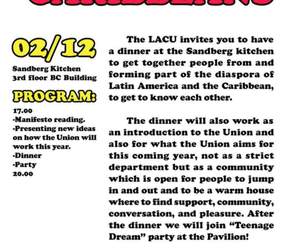 Are you interested in joining the Latin American and Caribbean Union? Come come come to our first meeting of the year on Monday 25th of October at 12:00 room 230!