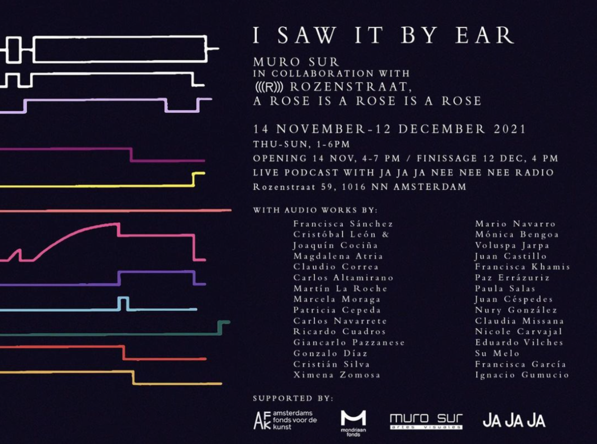 Let's gather and visit together this Chilean exhibition placed in Amsterdam during these days. It is a great opportunity to share and learn more about South American art, giving space in between our daily mostly European art inputs. The exhibition is called I Saw it by Ear, it is based on the recorded voices by artists describing an artwork to be.Through their narrations the artworks are activated in the mind of the public. For the exhibition at ROZENSTRAAT, the art initiative Muro Sur gathered a group of Chilean artists coming from different backgrounds and generations.