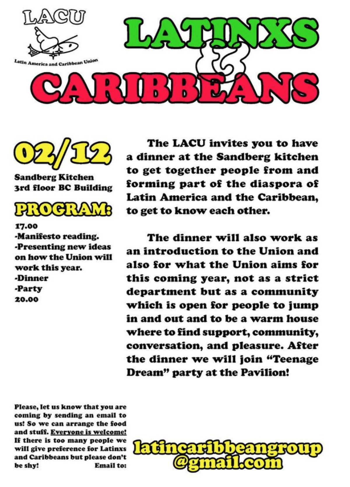 The LACU invites you to have a dinner at the Sandberg kitchen to get together people from and forming part of the diaspora of Latin America and the Caribbean, to get to know eachother.