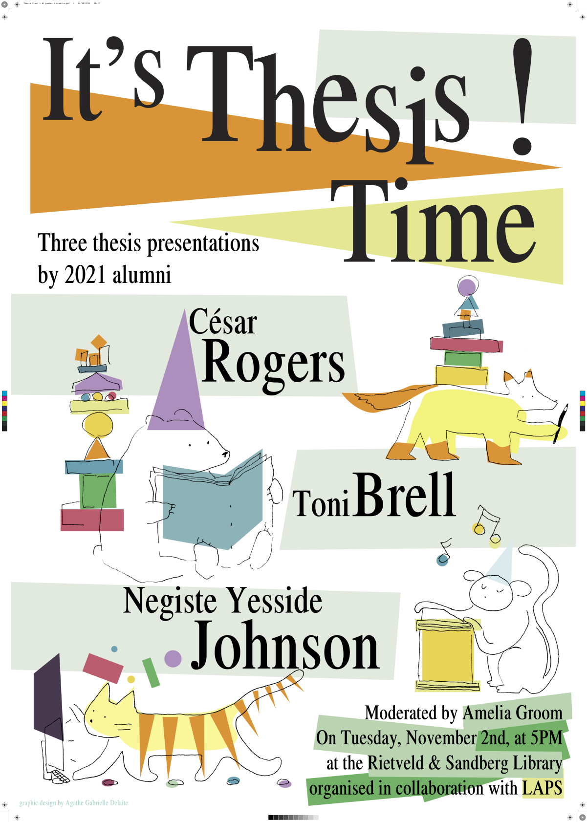 Please join us for three thesis presentations by Toni Brell, César Rogers and Negiste Yesside Johnson, 2021 graduates from the Rietveld Academie and Sandberg Institute. They will introduce their thesis subjects and engage in a conversation with writer and art historian Amelia Groom about their research methodologies, writing processes and thesis afterlives.