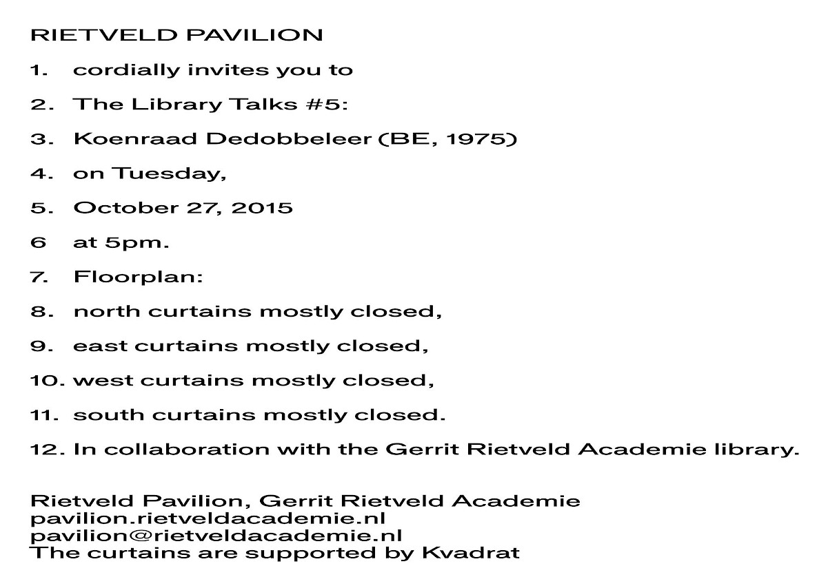 The Library Talks is a series of lectures held at the Rietveld & Sandberg library. Each talk revolves around a selection of books made by the speaker, assembled out of the library’s current collection as well as newly purchased books for the occasion.