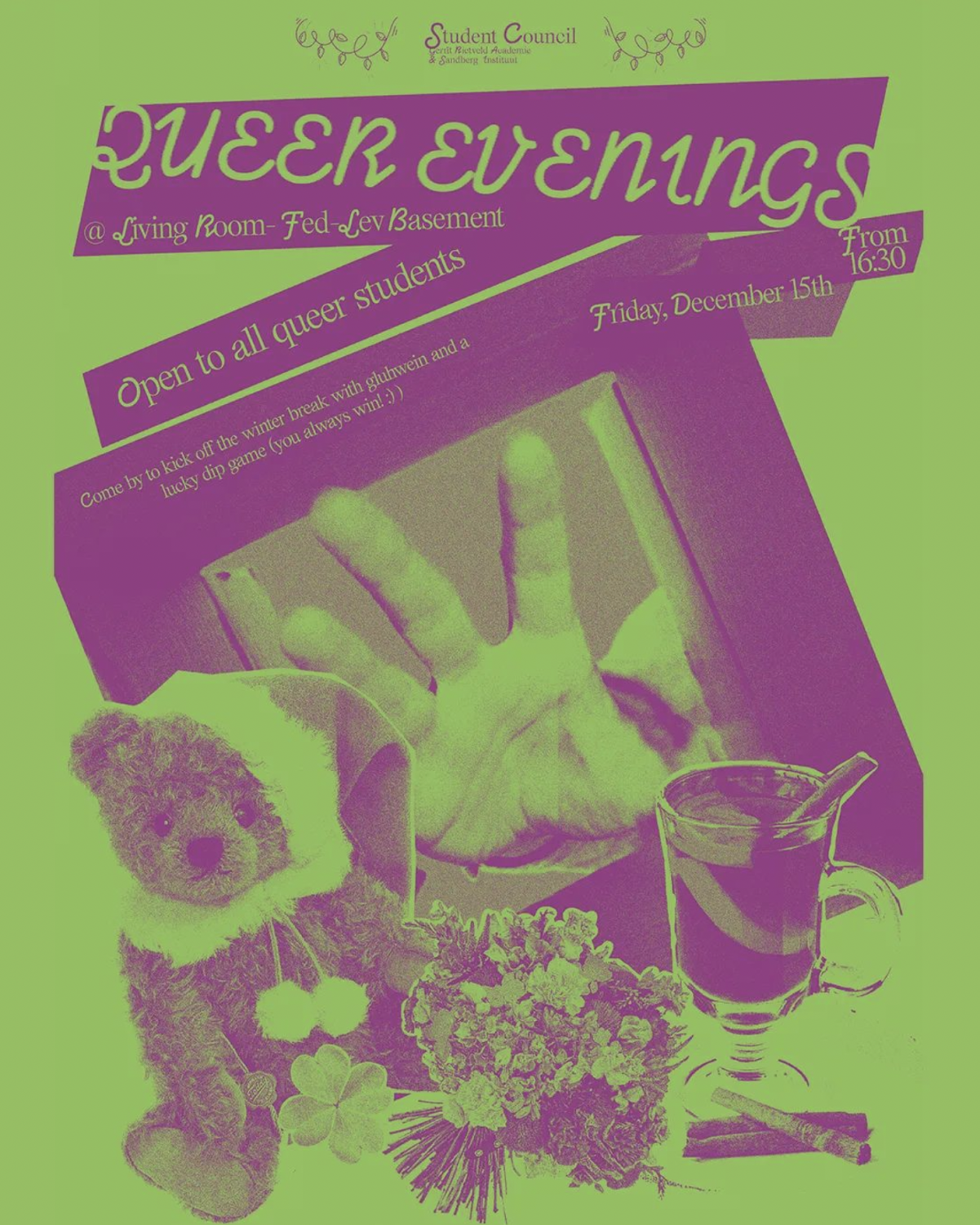 Come join us on the 15th of December from 16.30 for the queeeeeer evening series, this time in the living room! This event is open to all queer students.
