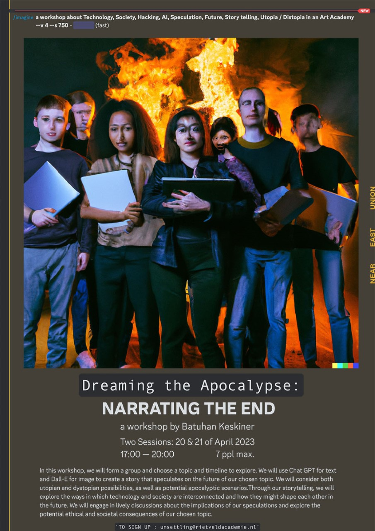 In this workshop, we will form a group and choose a topic and timeline to explore. We will use ChatGPT for text and Dall-E for image to create a story that speculates on the future of our chosen topic. We will consider both utopian and dystopian possibilities, as well as potential apocalyptic scenarios. Through our storytelling, we will explore the ways in which technology and society are interconnected and how they might shape each other in the future. We will engage in lively discussions about the implications of our speculations and explore the potential ethical and societal consequences of our chosen topic.