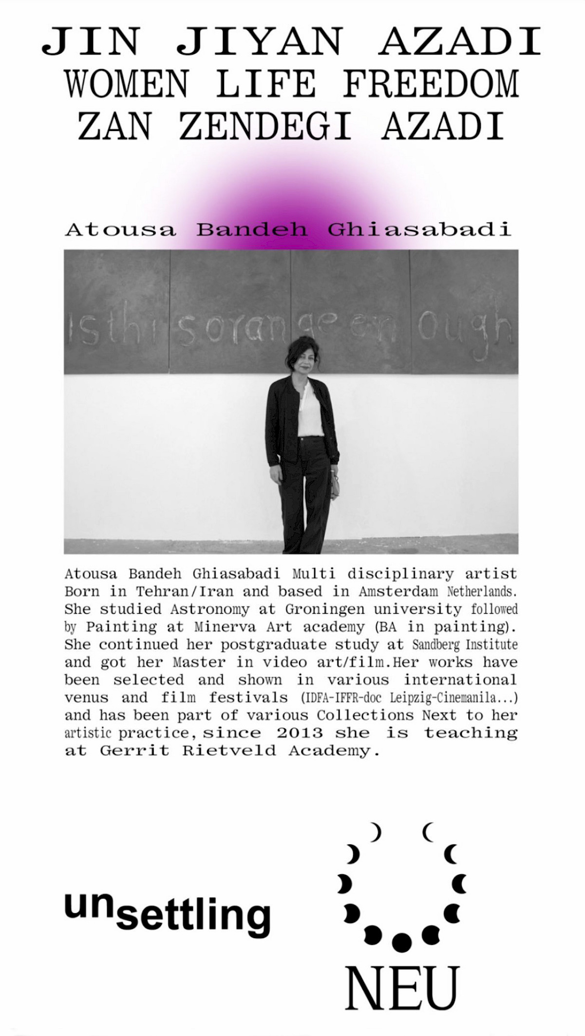 ON THE 10TH OF NOVEMBER 2022 WE WELCOME ARTIST ATOUSA BANDEH GHIASABADI TO START THE CONVERSATION ON JIN, JIYAN, AZADI (WOMEN, LIFE, FREEDOM) MOVEMENT, AND ON HOW ART CAN BECOME A STRONG INSTRUMENT OF CIVIL DISOBEDIENCE AND A FORCE FOR CHANGE.
