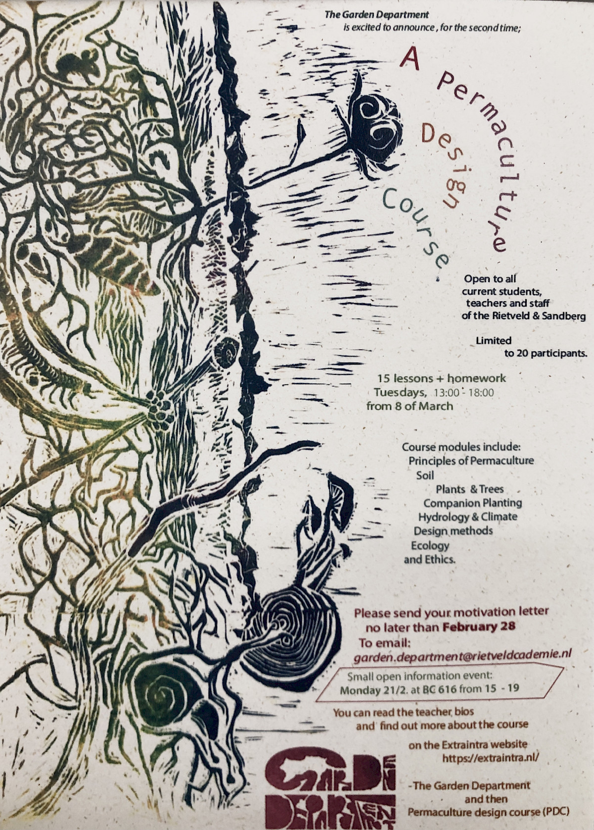 Over the next two semesters we will be organising a year-long Permaculture course that the Rietveld-Sandberg community can enroll on. We will also organise monthly events with invited guests, covering themes such as queer ecology, commons and communing, trauma-informed landscape design and medicinals for healing, social justice and climate change, inner and outer ecosystems, and quantum agriculture.