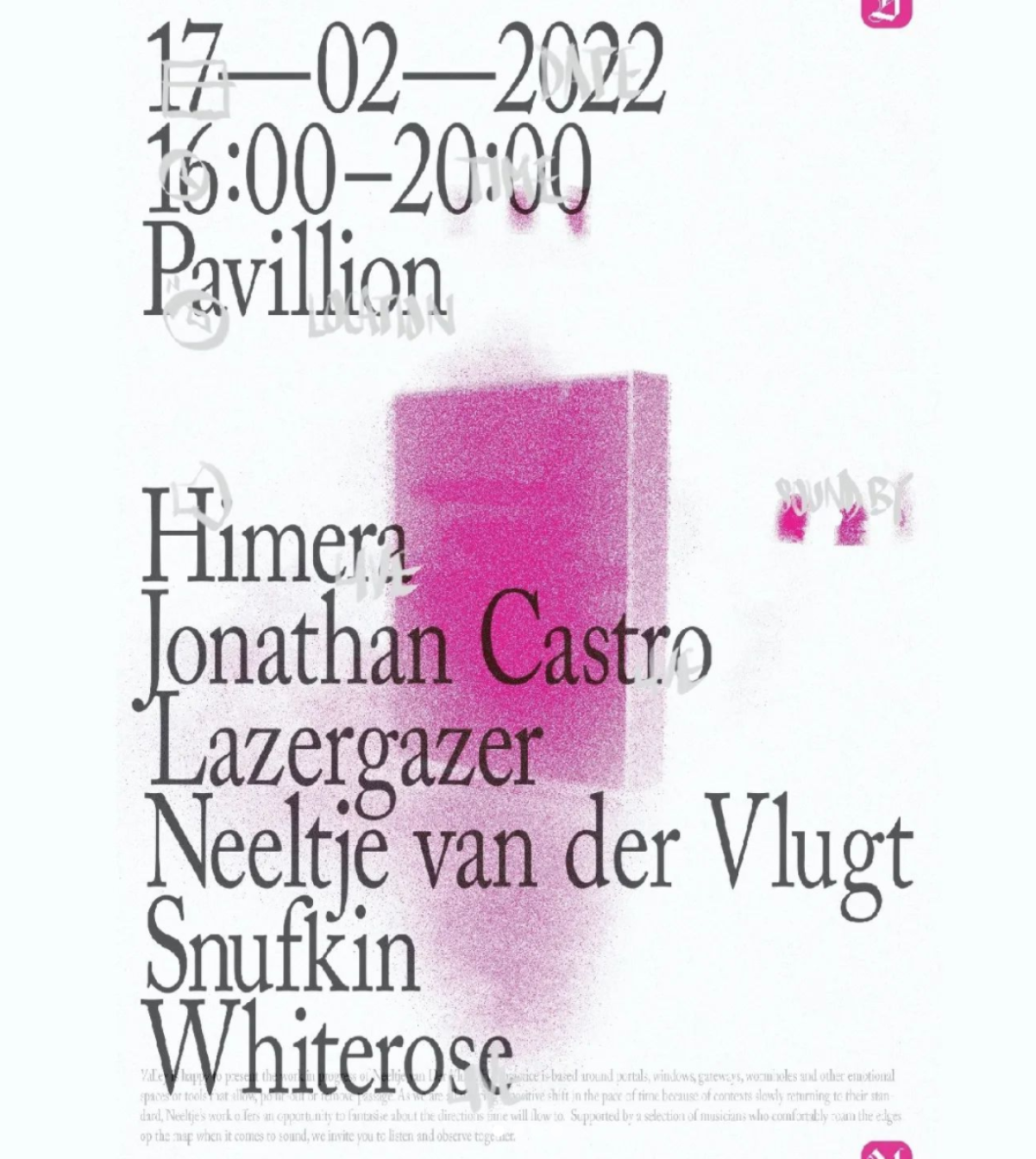 Valley @ The Pavilion are happy to present the work in progress of Neeltje van Der Vlugt. Currently her practice is based around portals, windows, gateways, wormholes and other emotional spaces or tools that allow, point-out or remove passage. As we are all noticing a positive shift in the pace of time because of contexts slowly returning to their standard, Neeltje’s work offers an opportunity to fantasise about the directions time will flow to. Supported by a selection of musicians who comfortably roam the edges op the map when it comes to sound, we invite you to listen and observe together.