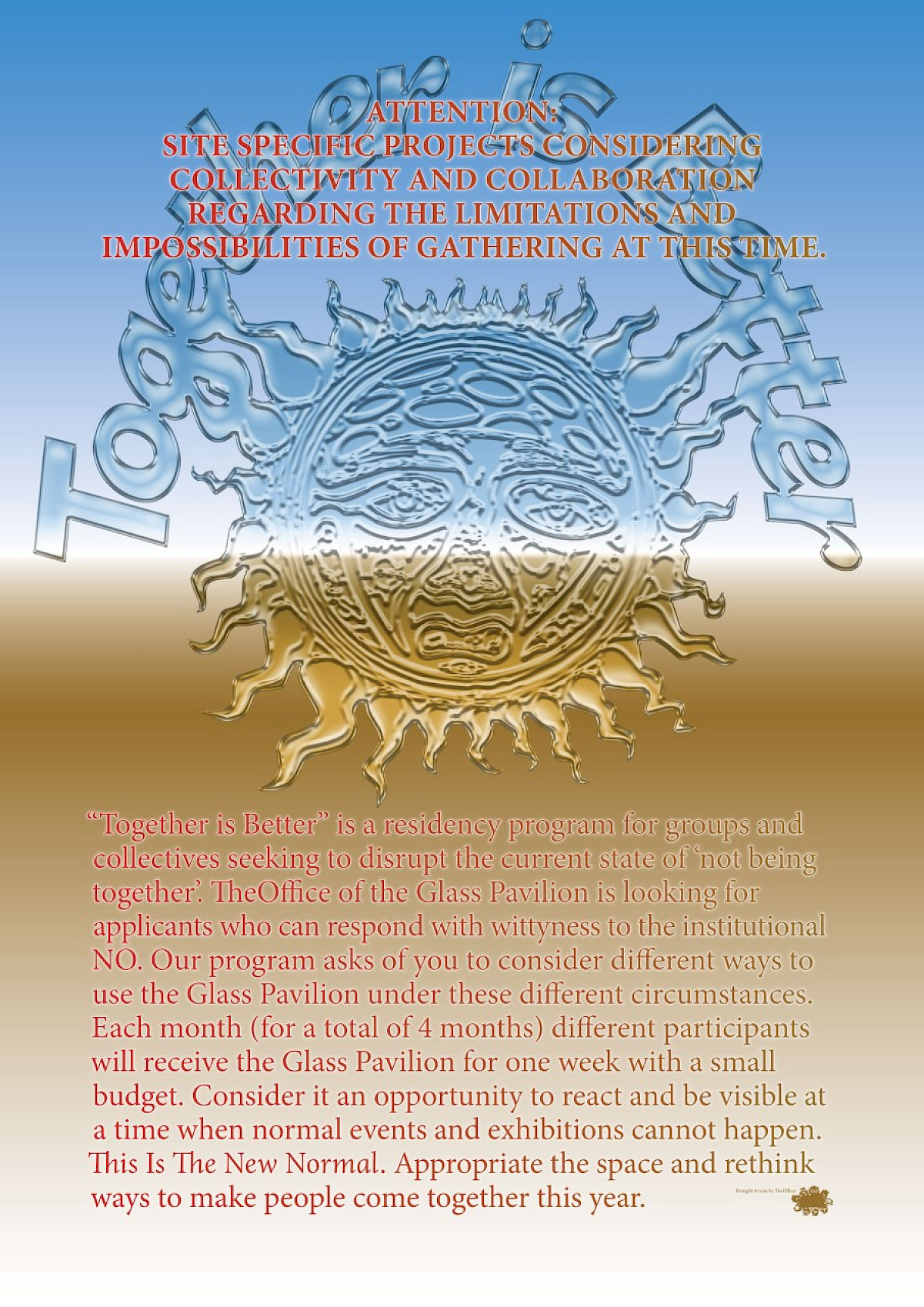 “Together is Better” is a residency program for groups and collectives seeking to disrupt the current state of ‘not being together’. TheOffice of the Glass Pavilion is looking for applicants who can respond with wittyness to the institutional NO. Each month (for a total of 4 months) different participants will receive the Glass Pavilion for one week with a small budget. Appropriate the space and rethink ways to make people come together this year.