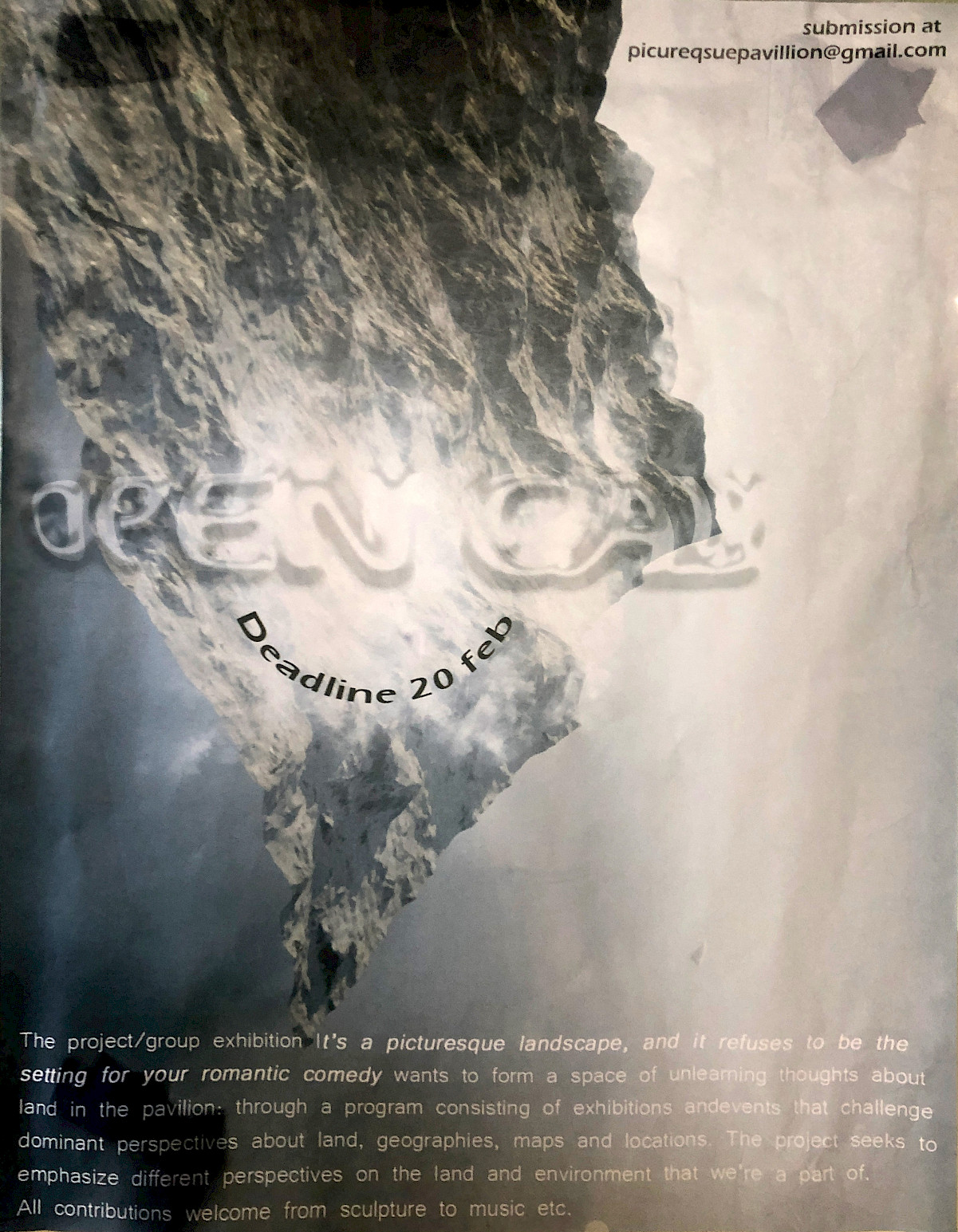The project/group exhibition "It's a picturesque landscape, and it refuses to be the setting for your romantic comedy" wants to form a space of unlearning thoughts about land in the pavillion: thought a program consisting of exhibitions and events that challange dominant perspectives about land, geographies, maps and locations. The project seeks to emphasize different perspectives on the land and environment that we're a part of.