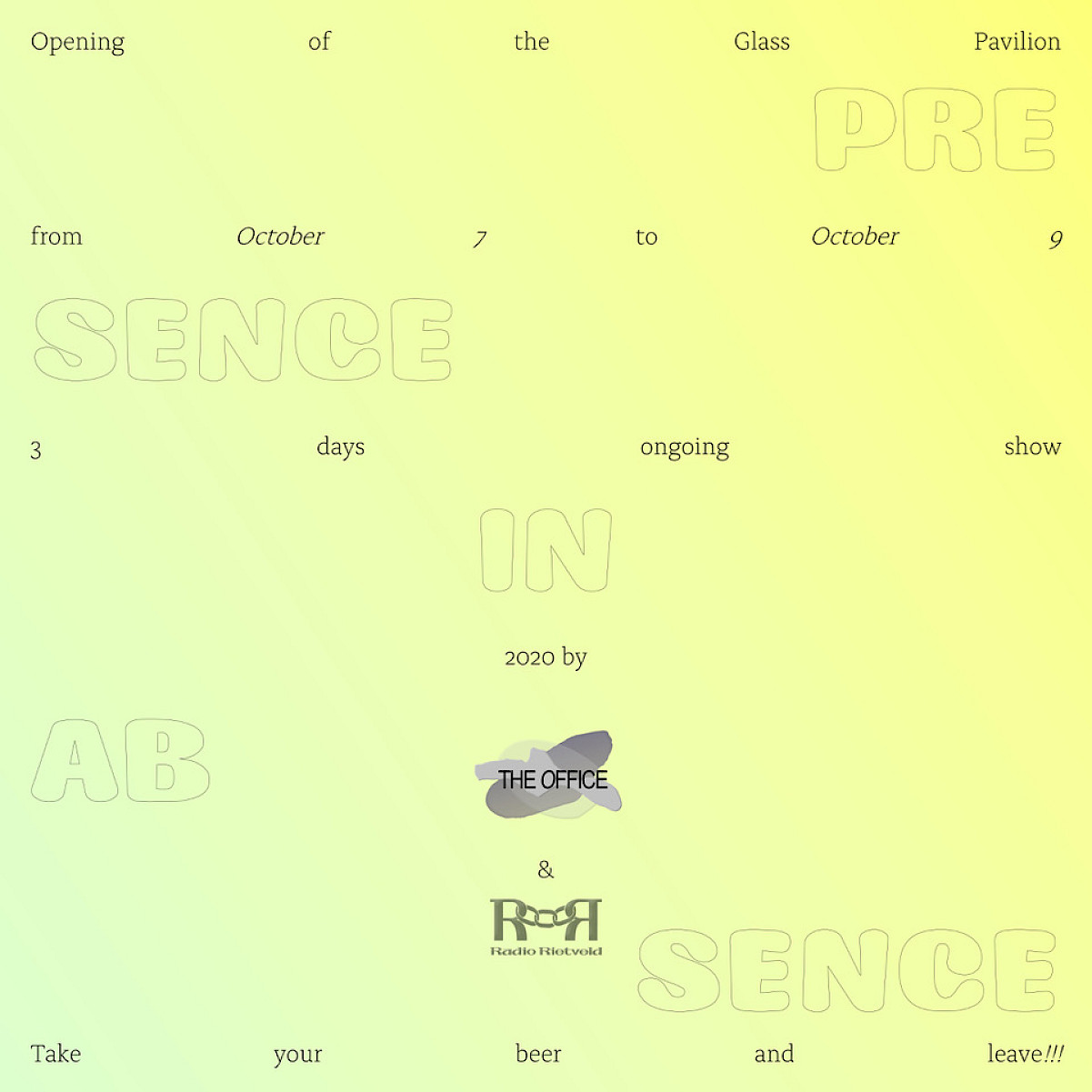Special collaboration with Radio Rietveld and Rietveld Journal on October 9. Takeover of Presence in Absence as their temporary office.