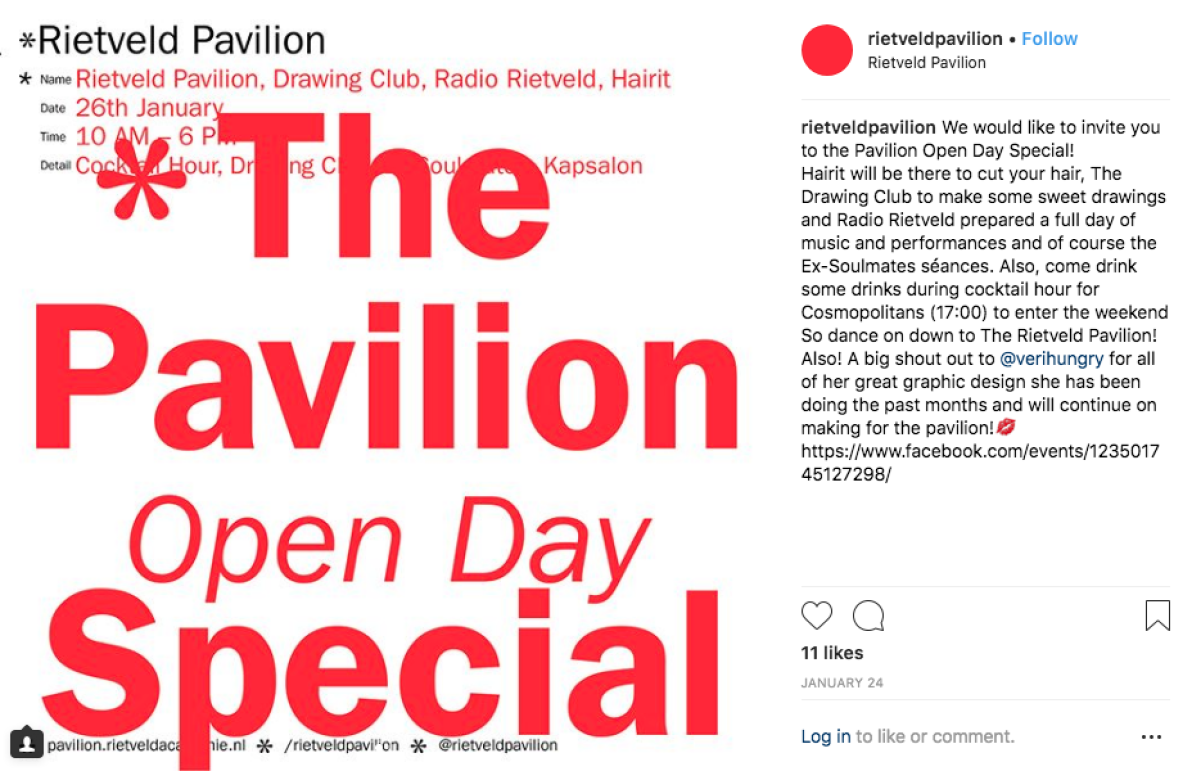 The Rietveld Pavilion is a student run project space of The Gerrit Rietveld Academie and The Sandberg Instituut. The Pavilion provides a platform for students to experiment, to discuss and to learn by making use of the autonomous space. The aim of the Pavilion is to keep the space active and alive, and to bring students together to exchange ideas and to support them in collaborative projects.