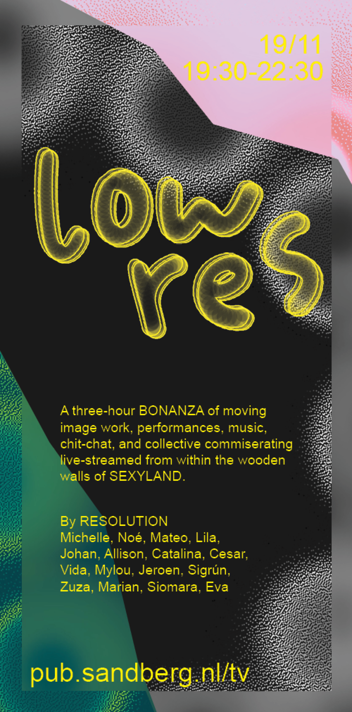 It will be a three-hour BONANZA of moving image work, performances, music, chit-chat, and collective commiserating live-streamed from within the wooden walls of SEXYLAND. An ELECTRIC program of drafts, failures, and successes from MA Moving Image students @ the Sandberg Institute. Tune in to bring some SPARK to your wintry Thursday night.