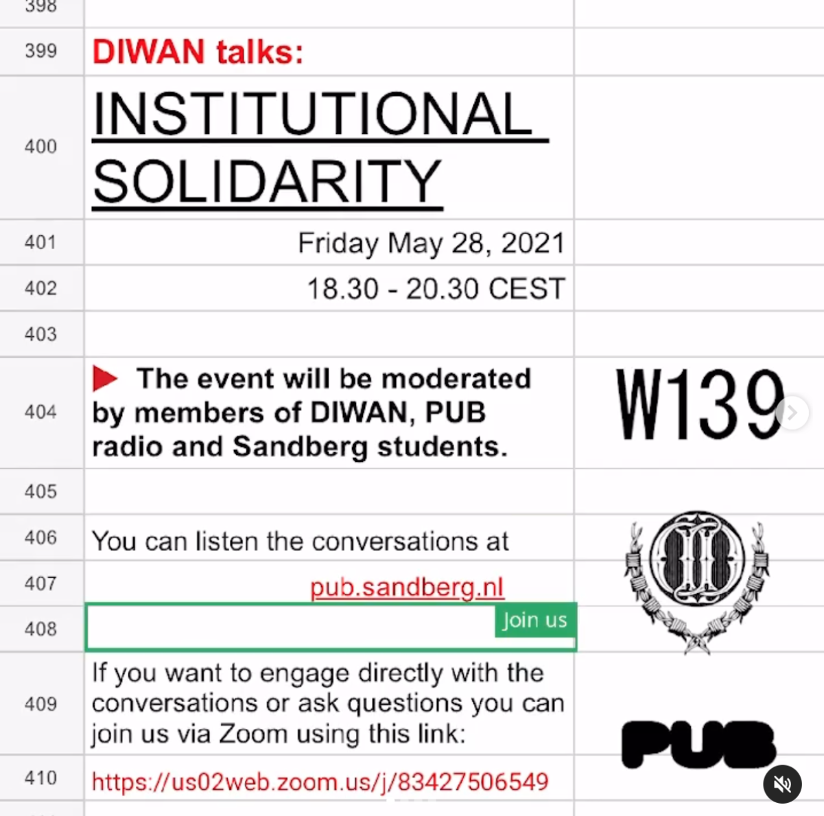 For this event, we are being hosted by PUB radio, a trans-departmental initiative funded and run by students of the Sandberg Institute. You can listen to the conversations via pub.sandberg.nl. If you want to engage directly with the conversations or ask questions you can join us via Zoom using this link: https://us02web.zoom.us/j/83427506549