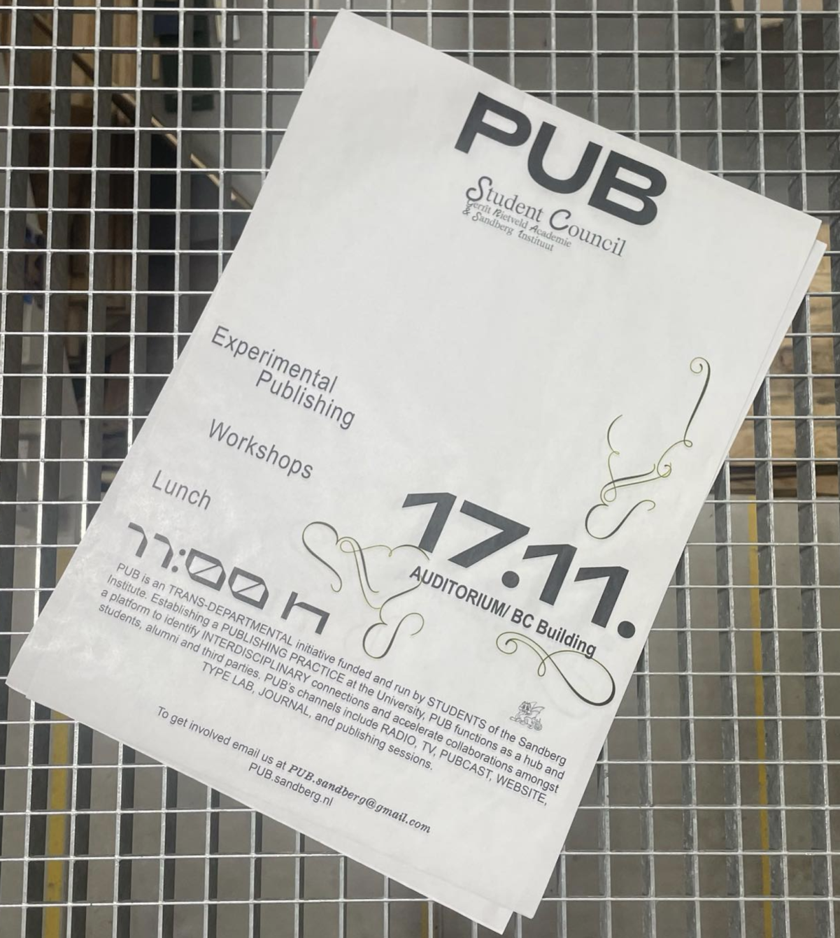 PUB is a transdepartmental initiative funded and run by students and alumni of Sandberg Institute. PUB functions as a hub and experimental publishing platforms to identify interdisciplinary connections and accelerate collaborations amongst students, alumni and third parties.