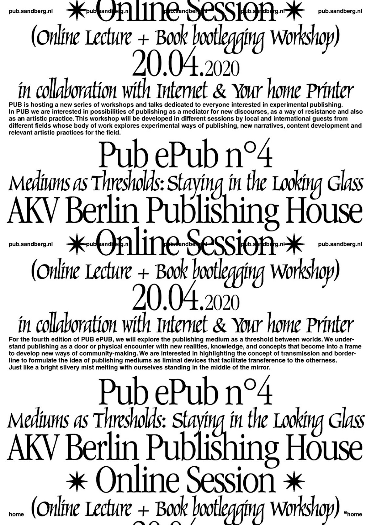 PUB is happy to virtually host the first session of the 4th Pub ePub session with AKV Berlin. In this new online workshop, the attendants will produce two books that are key topics of the online lecture by our first guests, AKV Berlin Publishing House: Study, Not Critique and Death of an Art Critic (the book will be around 30 pages).