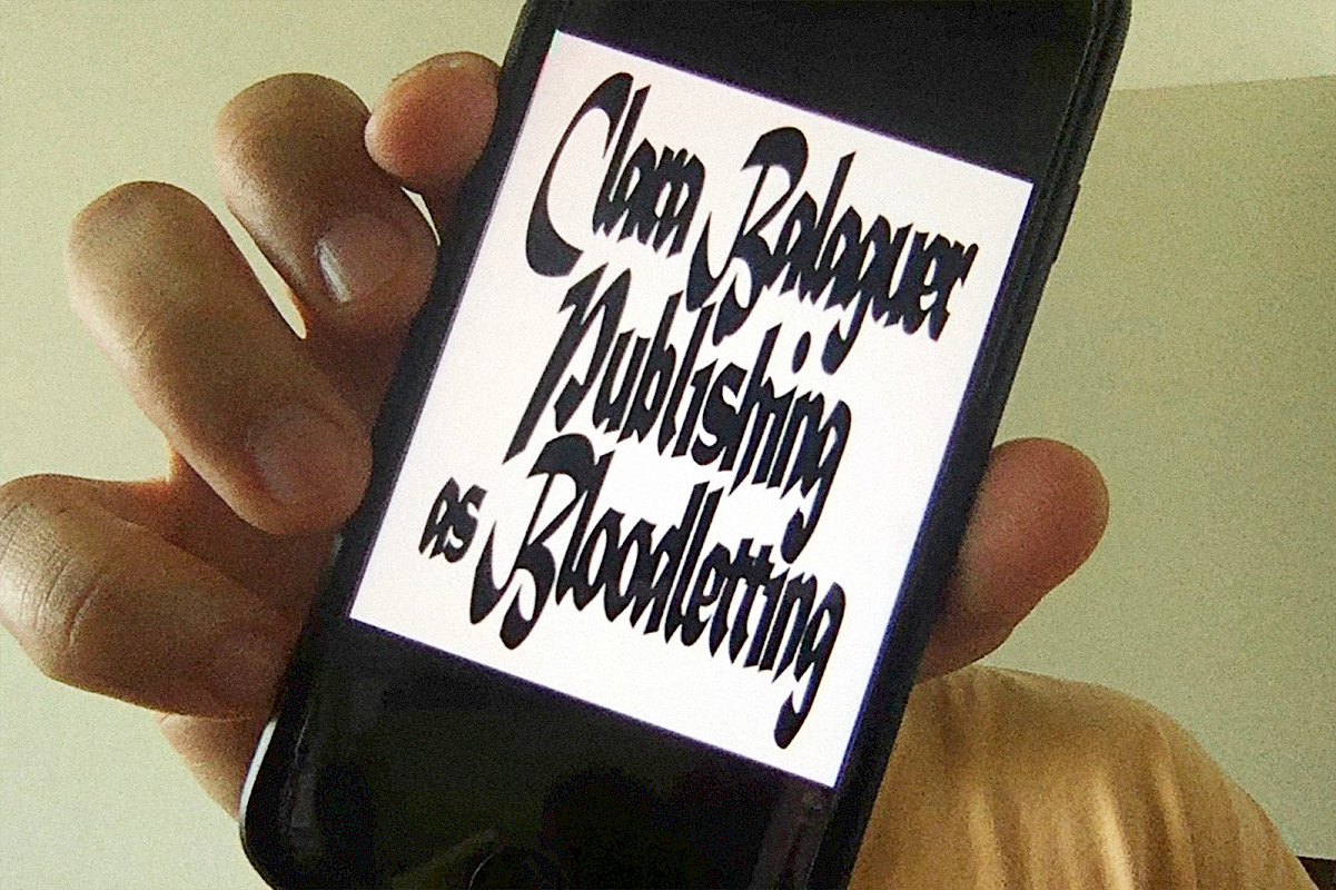 Another edition of Publishing as Bloodletting, a two-fold essay and play about the politics of circulation in the body public, written from the perspective of a migrant publisher. As this publication oscillates between the visible (text) and the audible (voice), so must the conversation around it also be structured. The play has been performed in multiple iterations: as a monologue, with volunteer readers, with the original cast of friends, and most recently, in radio TV format. This bleeding edge issue is the second attempt to perform a lecture choreography that experiments with non-simultaneity of sight and sound in public speaking. The conversation about the essay-play will attempt to move, literally at times, through what has been read, what is being seen, and what can't be heard. The first rehearsal was not entirely successful due to Nazi zoombombers, unfamiliar broadcast software, and mild exhaustion of the lecturer.