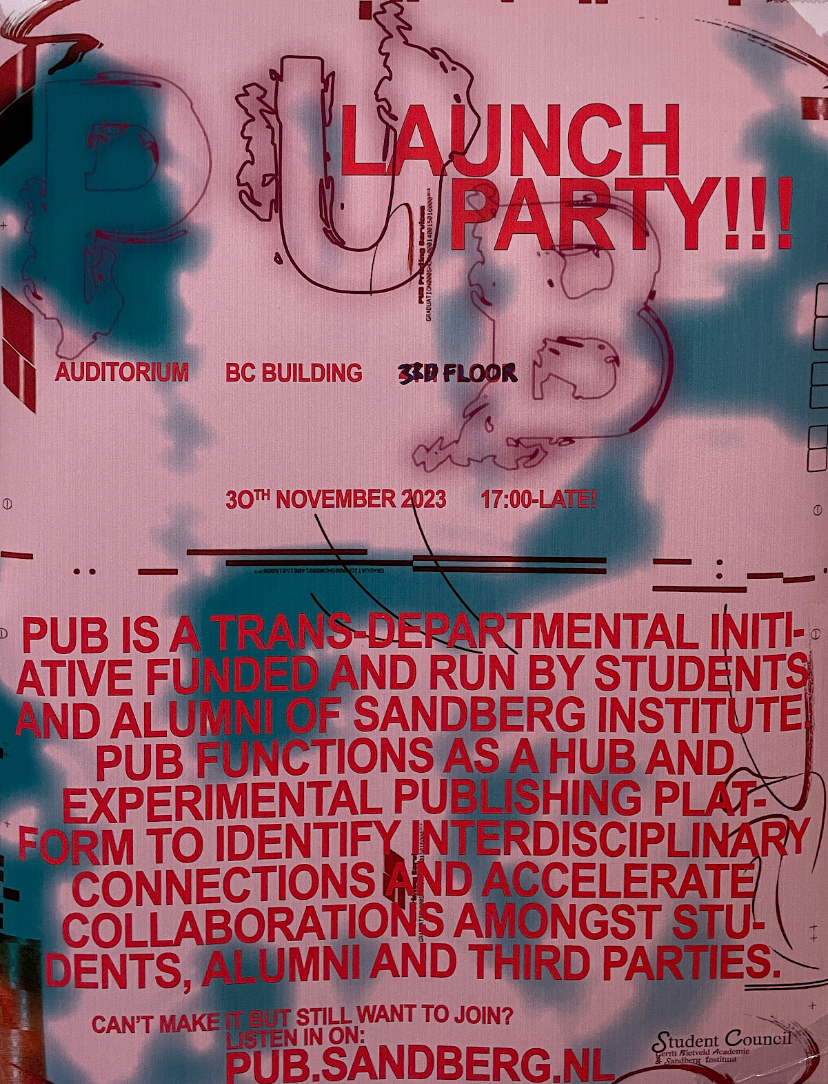 PUB is a transdepartmental initiative funded and run by students and alumni of Sandberg Institute. PUB functions as a hub and experimental publishing platforms to identify interdisciplinary connections and accelerate collaborations amongst students, alumni and third parties.