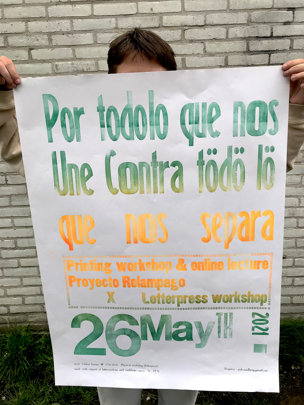 Dear Community, We have been organizing in collaboration with the Latinamerican and Caribbean union, a series of lectures and workshops that seek to redirect the gaze to cultural producers of the global south. For this occasion, we invited the letterpress workshop (Joos and Theo) to talk and with Valeria Giraldo from Proyecto Relámpago (Colombia) and discuss the importance and power of letterpress printing, also Proyecto Relámpago will talk about their ongoing research about demonstration posters in Colombia, this will be an online conversation.