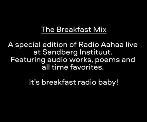 Special edition of Radio Aahaa live at Sandberg Instituut. Featuring audio works, poems and all time favorites. It’s breakfast radio baby!