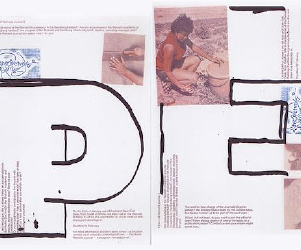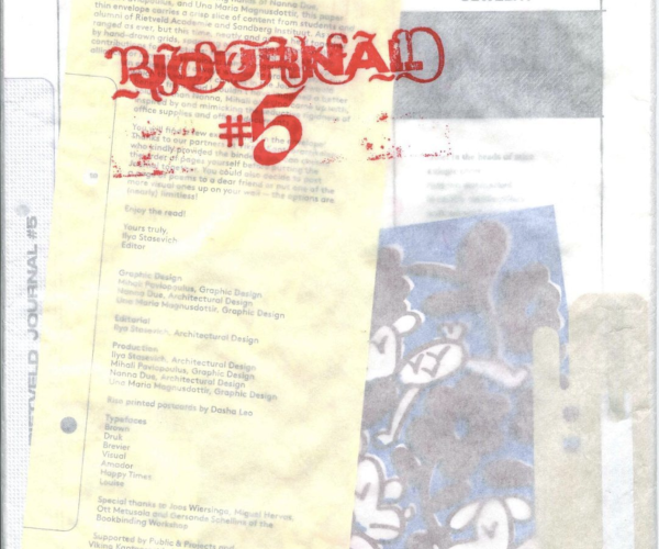 A bi-annual primarily text based publication, designed, curated and edited by Rietveld students; with submissions by both Rietveld and Sandberg students. Distributed for free within the school and out in the city.