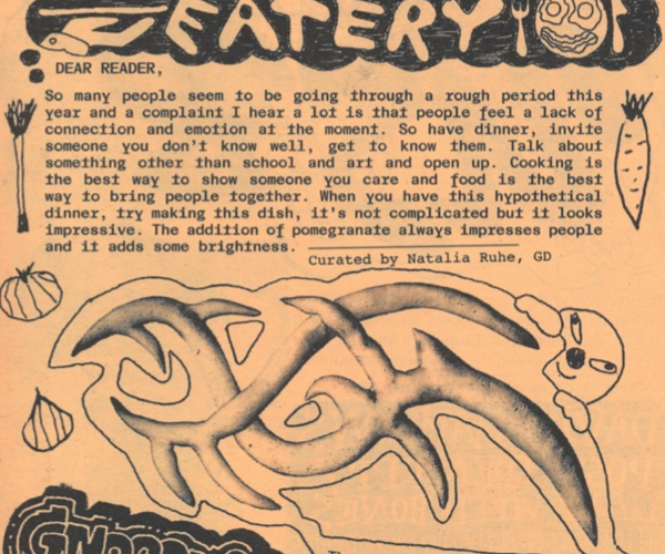 The Eatery section of the 4th Edition of the Rietveld Journal is open for submissions again! Feel free to submit anything relating to food, cooking, eating, rituals of the meal. Anything from recipes, reviews, poetry to drawings or photography. Everything is welcome!
