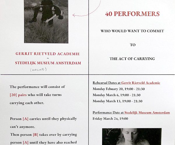 For an upcoming performance at the Stedelijk museum this Rietveld student is seeking 40 performers who would commit to the act of carrying.