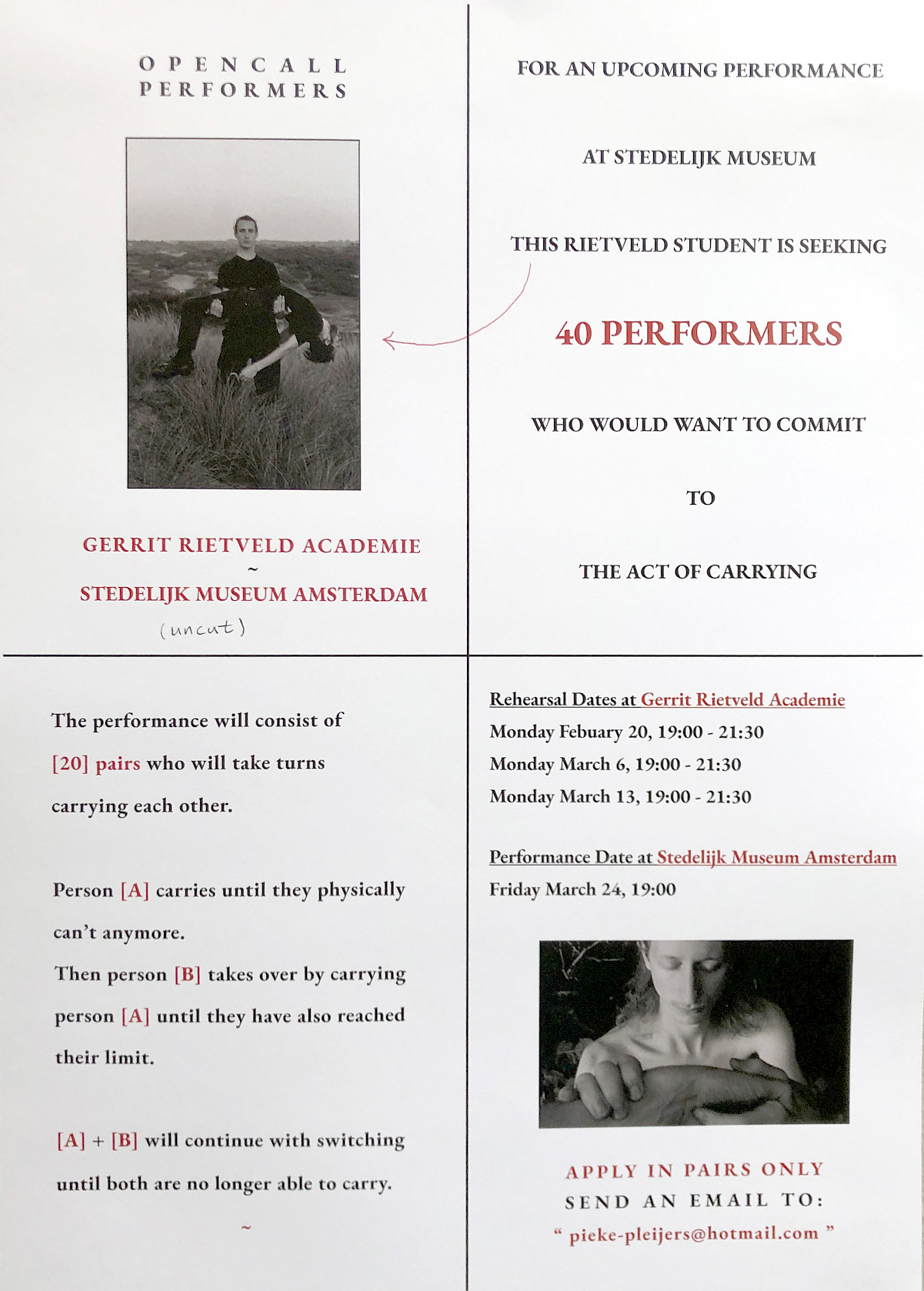 For an upcoming performance at the Stedelijk museum this Rietveld student is seeking 40 performers who would commit to the act of carrying.