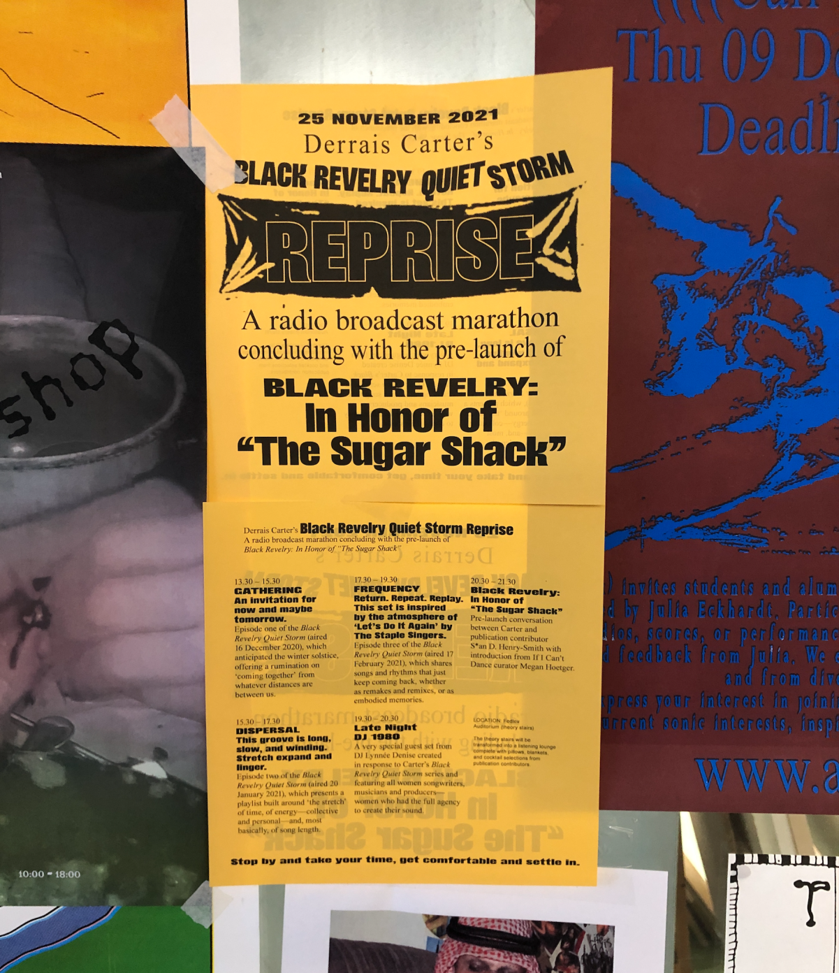 Black Revelry Quiet Storm is a three-part radio show that explores different modes of storytelling, placing Carter himself in the role of the late-night DJ. The show takes its inspiration from the inherently nocturnal ‘Quiet Storm’ radio format that originated in the 1970s and featured songs about romance and intimacy from the genres of jazz, soul, and R&B. Black Revelry Quiet Storm is commissioned by If I Can’t Dance and is part of the broader Black Revelry project, which takes up the detail—or “the sample”—as a method for reading the iconic 1976 painting Sugar Shack by Ernie Barnes, a painting that has circulated widely within Black popular culture (for example, as the cover art for Marvin Gaye’s album I Want You) across over four decades. In so doing, Black Revelry enacts Black intimacy and maps an affective Black social life in the United States as it has been registered through the painting’s circulation.