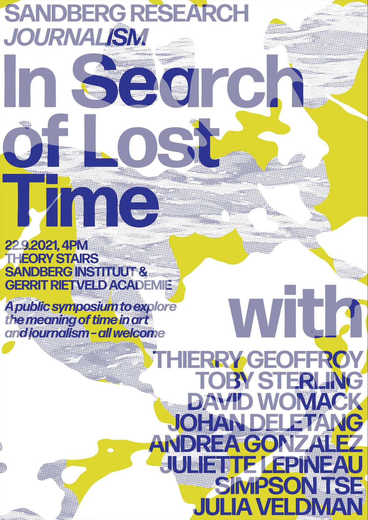 On Wednesday 22nd we welcome you to the first Sandberg Research event In Search of Lost Time, hosted by Gabrielle Kennedy. During the sympsium, invited guests Thierry Geoffroy and Toby Sterling alongside alumni David Womack, Johan Deletang, Andrea Gonzalez, Juliette Lépineau, Simpson Tse and Jelia Veldeman will present their research in order to explore the meaning of time in art and journalism. The symposium takes place at Theory Stairs at 4pm.