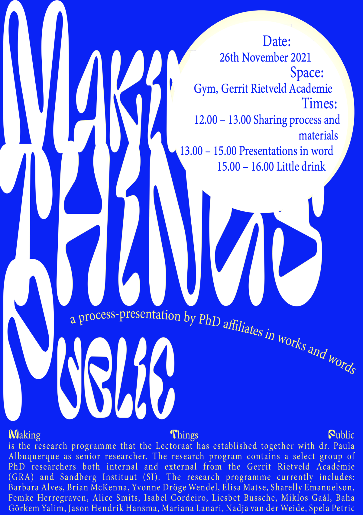 Making Things Public is the research programme that the Lectoraat established together with dr. Paula Albuquerque as senior researcher. The research program contains a selcted group of PhD researchers both internal and external to the Gerrit Rietveld Academie (GRA) and Sandberg Instituut (SI). The research programme currently includes: