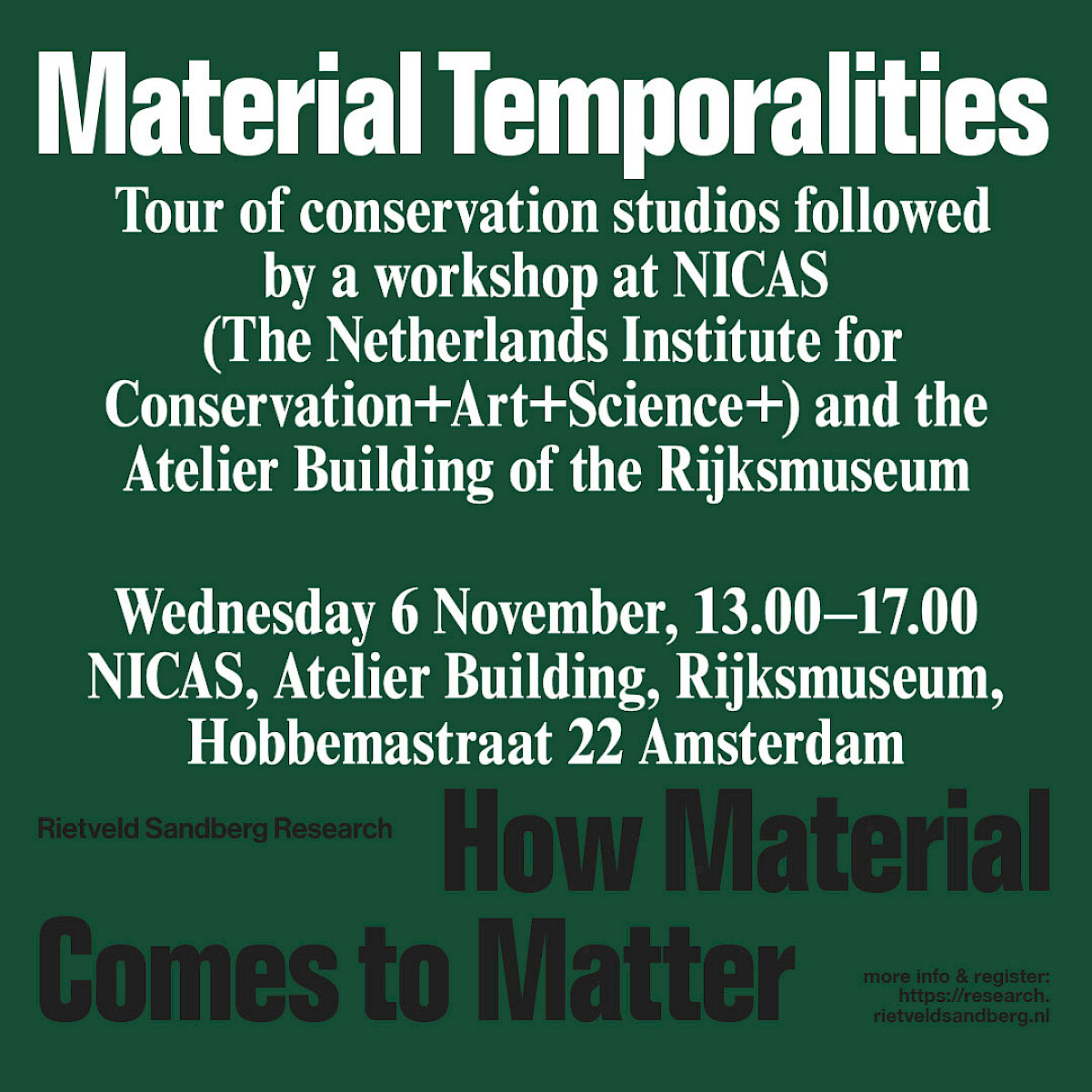 Rietveld and Sandberg students are invited to join our workshop Material Temporalities on 6 November. This workshop offers a rare opportunity to visit and work in the Atelier Building of the Rijksmuseum. During the first part of the workshop you will receive an in-depth introduction to the workshops and laboratories at NICAS, exploring different temporalities of art-making through the lens of material-based research. In the second part of the workshop students will be invited to engage in exercises and discussion evolving from their own material experimentations through the lens of preservation and restoration.