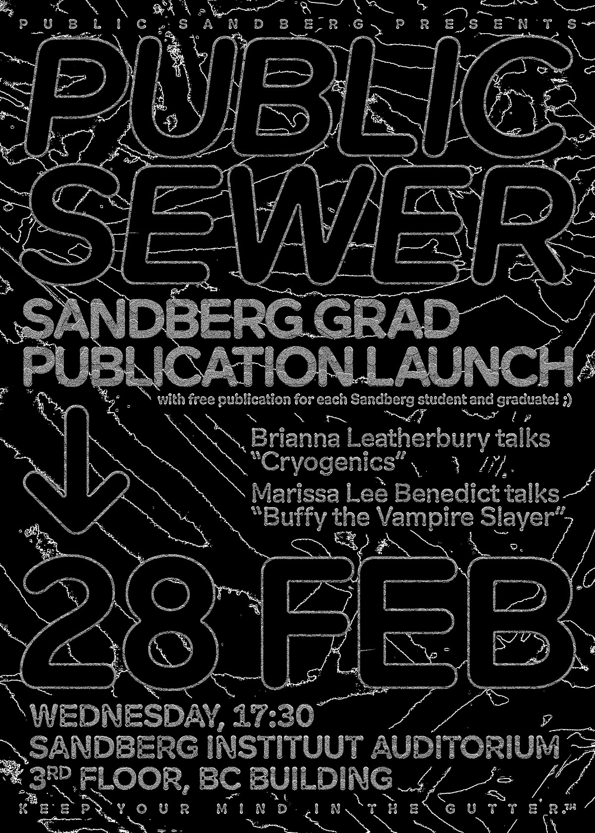 All Sandberg graduates from 2023, current Sandberg students, and Sandberg staff are welcome to come pick up a free copy of the publication at the launch. Alongside this we will be hosting a special iteration of PUBLIC SEWER (Public Sandberg's talk series which asks people to step outside the bounds of their ordinary research interests to speak upon a para-academic topic that's festering in the margins of what they do).