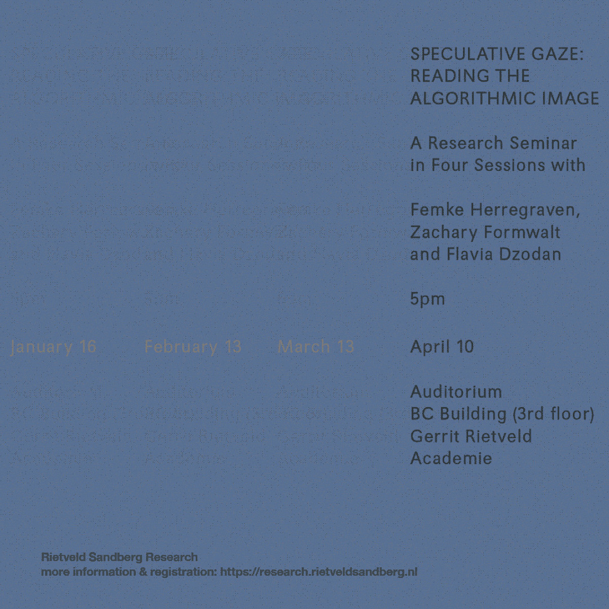 This seminar is a space for shared inquiry, diverse methodologies, and interdisciplinary dialogue. Through our explorations, we hope to challenge traditional notions of intentionality, and what it means to engage with an image that resists human-centric meaning. In Speculative Gaze, we hope to create a collective, reflective space where algorithmic images are not only analyzed but are also seen as mirrors, reflecting back our own assumptions, insights, and speculative connections.