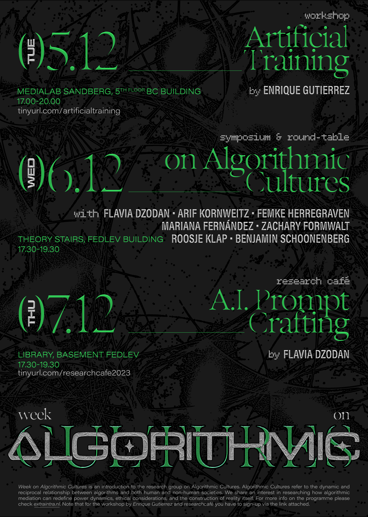 Week on Algorithmic Cultures is an introduction to the research group on Algorithmic Cultures. Algorithmic cultures refer to the dynamic and reciprocal relationship between algorithms and both human and non-human societies. We examine not only how algorithms are informed by and embedded within cultural norms, values, institutions, and behaviors but also how they, in turn, actively shape these dimensions. As algorithmic processes increasingly blur the boundaries of everyday life, they significantly influence the ways in which individuals and communities interact, engage with, and transform knowledge and culture. We share an interest in researching how algorithmic mediation can redefine power dynamics, ethical considerations, and the construction of reality itself.