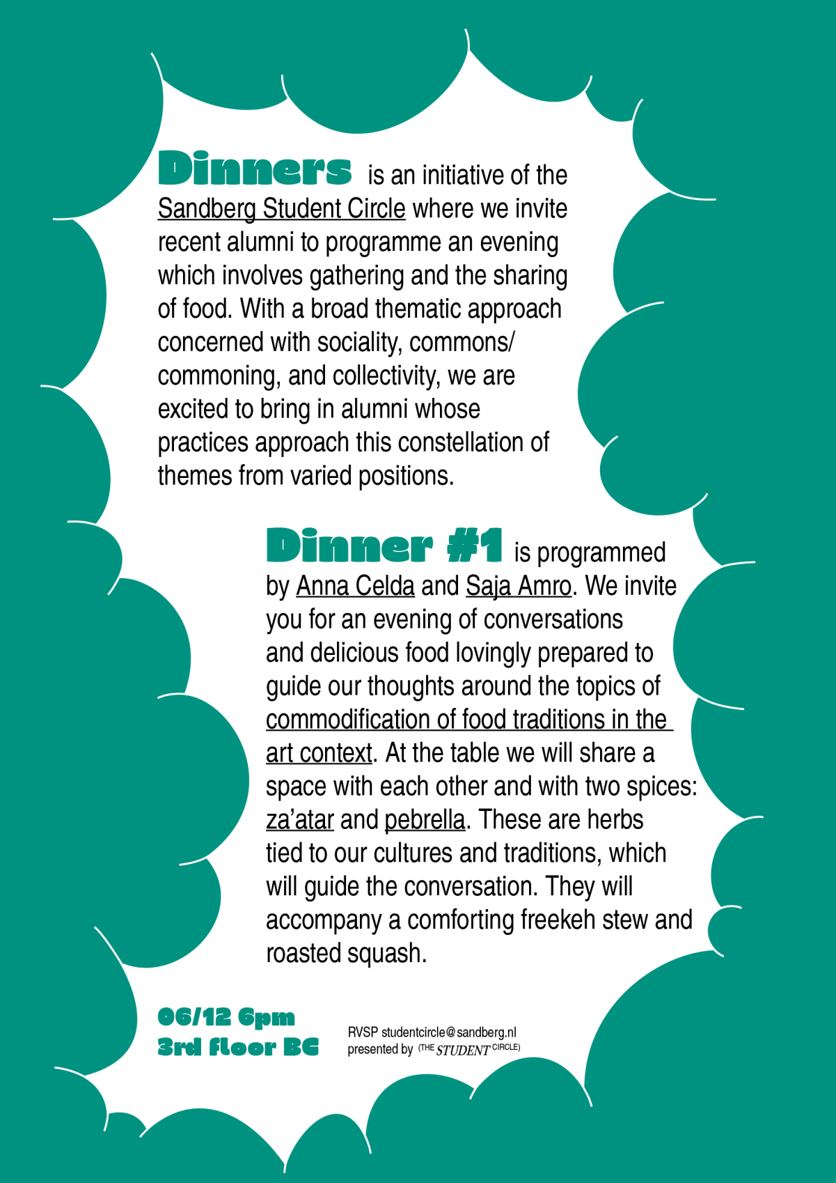 The Sandberg Student Circle is hosting a series of dinners where we invite recent alumni and current students to programme the evening. With a broad thematic approach concerned with sociality, commons/commoning, and collectivity, we are excited to bring in artists whose practices approach this constellation of themes from varied positions. Whether a listening party, workshop, lecture, guided walk, film screening, speculative presentation, game play-through, tasting menu, reading, a collection of all the above or something else entirely, the only criteria is that the evening involves, at some point, a dinner/the sharing of food.