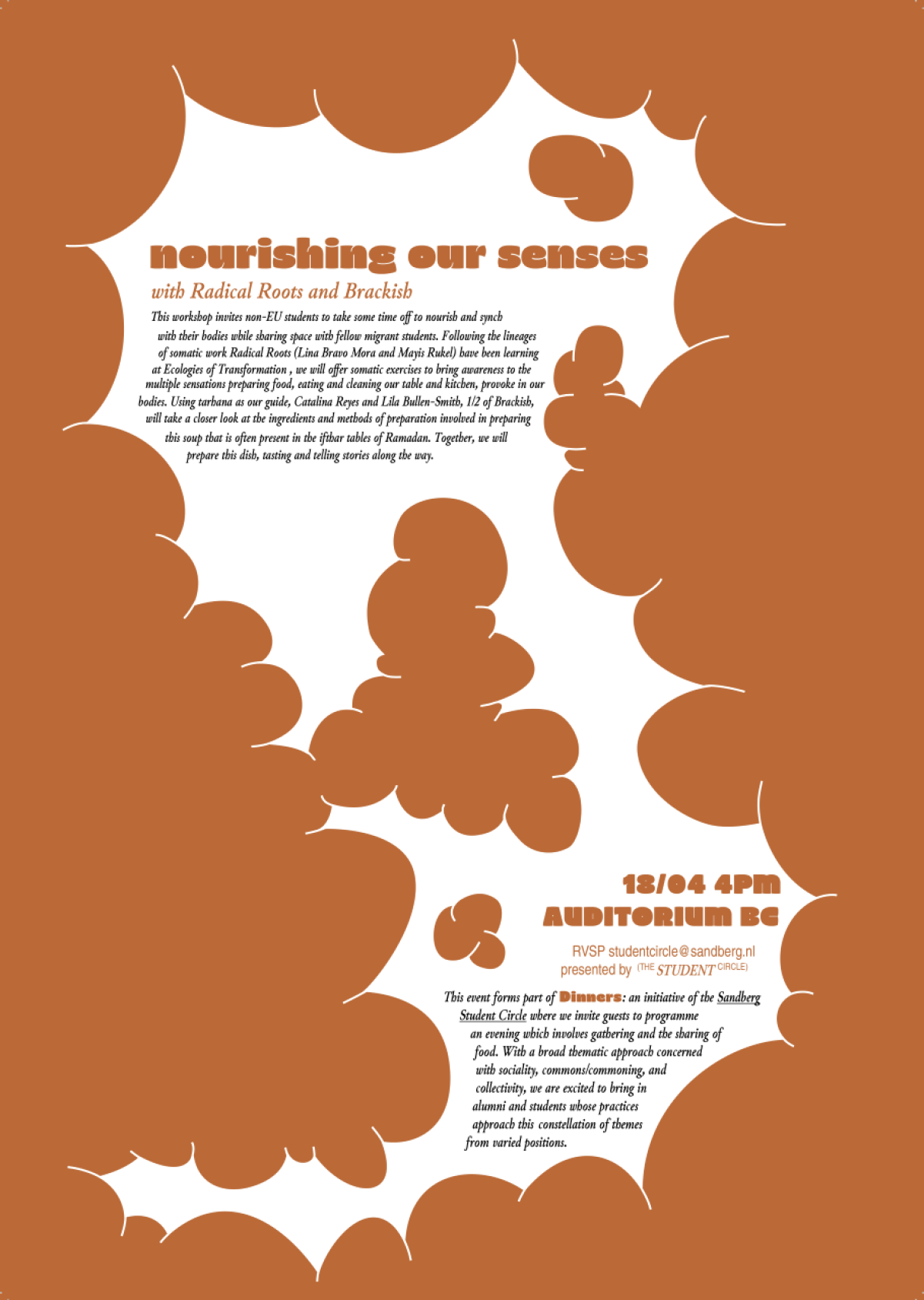 For the second event in this series, we invited RadicalRootsProject (Mayis Rukel and Lina Bravo Mora) and Brackish to programme an evening responding to this theme. This workshop will invite non-EU students to take some time off to nourish and synch with their bodies while sharing space, and possibly connect with fellow migrant students. Following the lineages of somatic work Mayis and Lina have been learning at Ecologies of Transformation with Char CA, Joy Mariama Smith, and Camille Barton, we will offer some somatic exercises to bring awareness to the multiple sensations preparing food, eating and cleaning our table and kitchen, provoke in our bodies. Using the ingredient tarhana as our guide, Catalina and Lila, 1/2 of the Brackish collective, will take a closer look at the ingredients and methods of preparation involved in preparing this soup that is often present in the ifthar tables of Ramadan. Collectively, we will prepare this dish - tasting and telling stories along the way - with the somatic exercises facilitated by Radical Roots. A moment to check in with ourselves and receive nourishment from both the non-EU community and the amazing food.