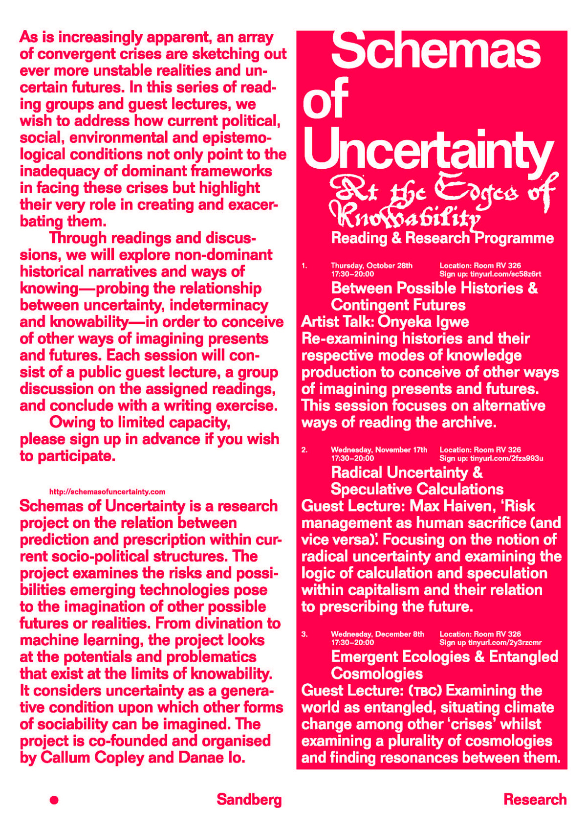 Schemas of Uncertainty is a research project on the relation between prediction and prescription within current socio-political structures. The project examines the risks and possibilities emerging technologies pose to the imagination of other possible futures or realities. From divination to machine learning, the project looks at the potentials and problematics that exist at the limits of knowability. It considers uncertainty as a generative condition upon which other forms of sociability can be imagined. The project is co-founded and organised by Callum Copley and Danae Io. http://schemasofuncertainty.com/