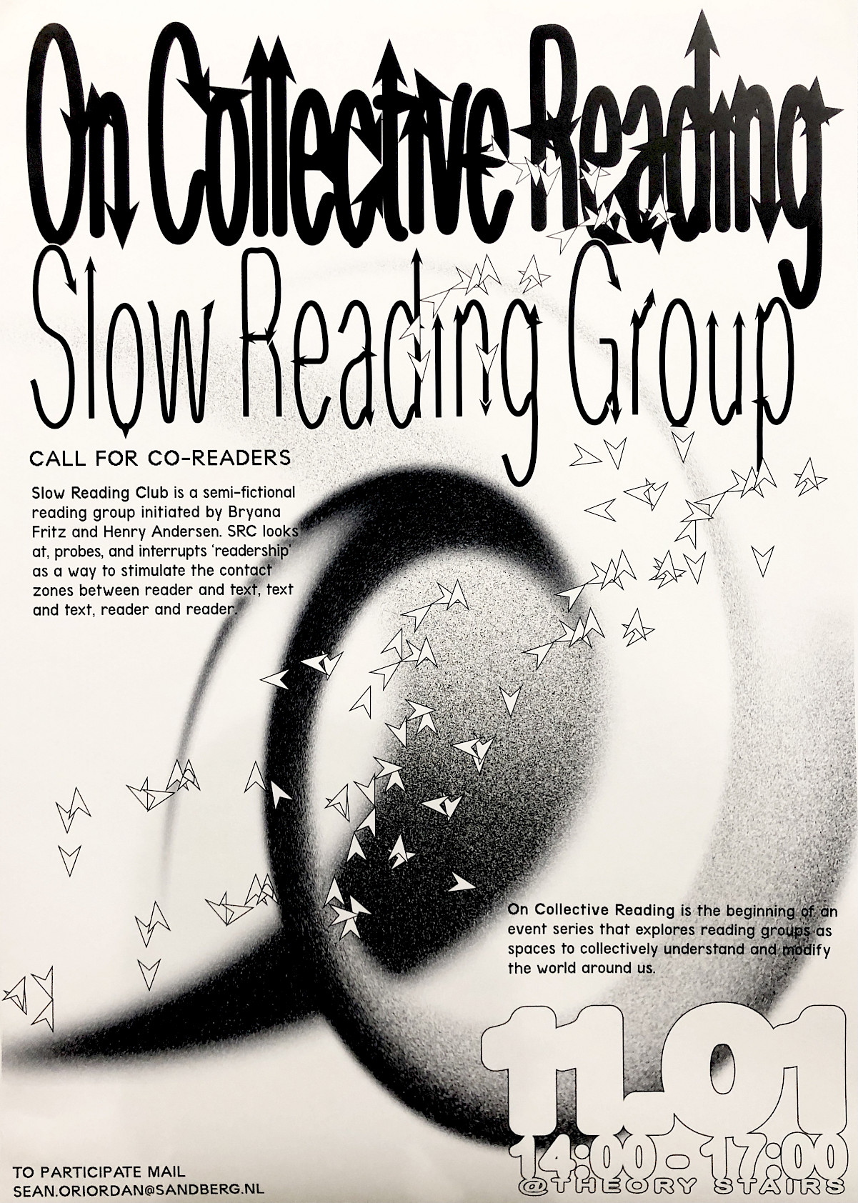 Slow Reading Club is a semi-fictional reading group initiated by Bryana Fritz and Henry Andersen. They deal in constructed situations for collective reading to probe the ways in which “meaning” passes between bodies in the act of reading. SRC seeks to occupy and eroticise this space of transmission between text and reader, reader and reader, text and text. They want to dwell in the unstable space of reading itself, to intensify what Spivak calls “the possible menace of a space outside of language” that is opened up in reading and in love.