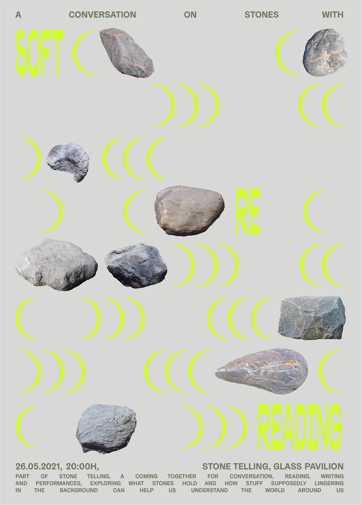 The next softcore reading session will be conversing with stones on 26 May at 20.00, in the Glass Pavilion at the Gerrit Rietveld Academie.